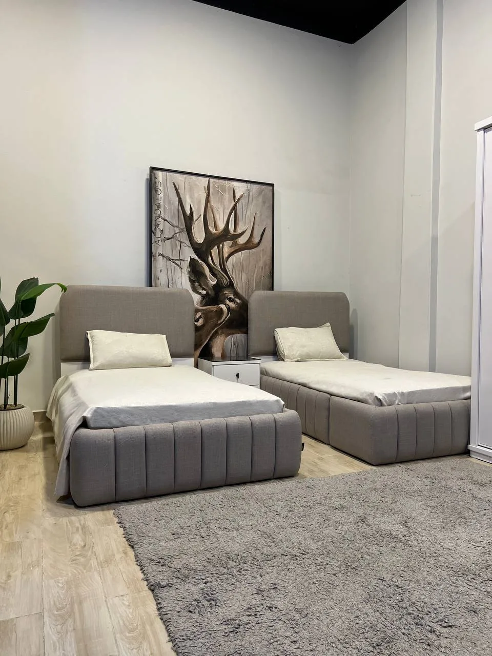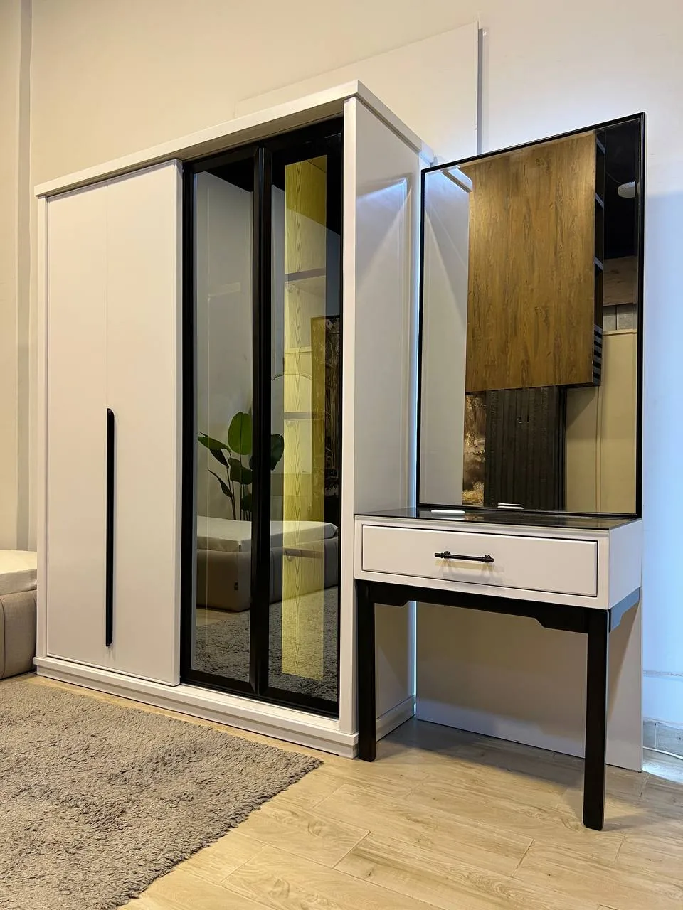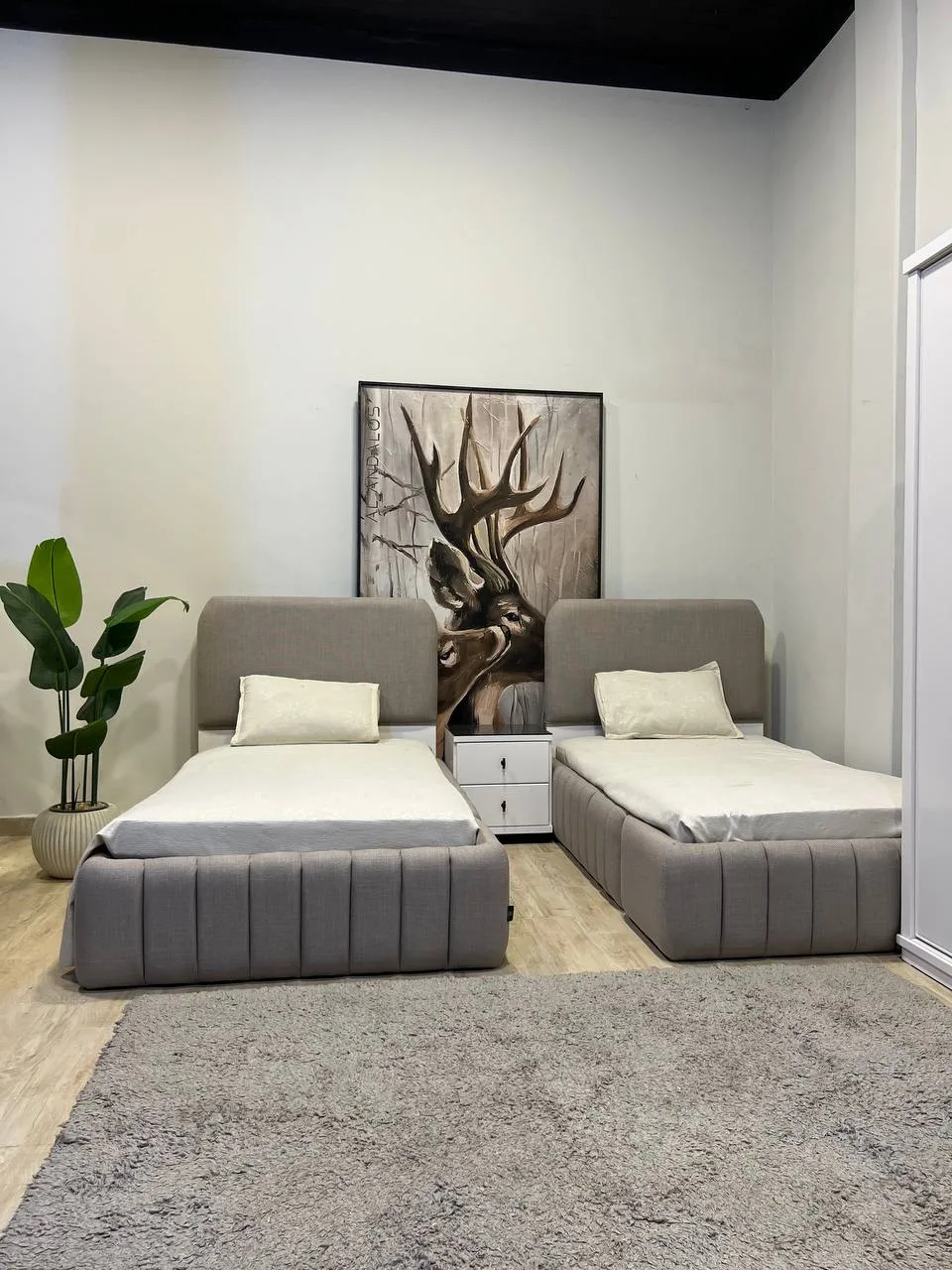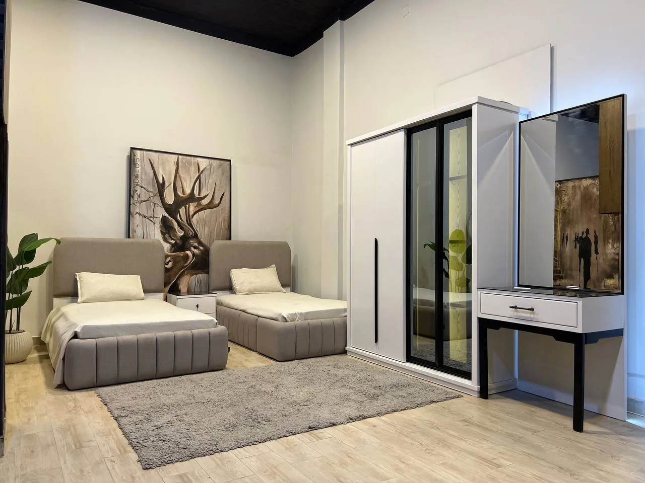 2سرير 120سم + كمود 55سم + دولاب جرار 160سم + تسريحة مُثبتة بالدولاب مع برواز بانوراما .