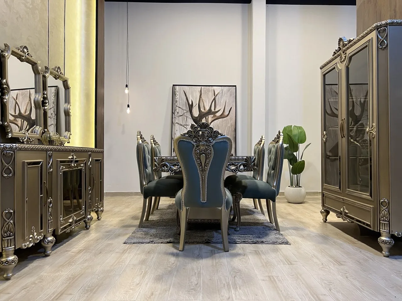 نيش 140سم + بوفيه 210سم + برواز مرايا مُعلقة + تربيزة 200سم + 6 كرسي .
