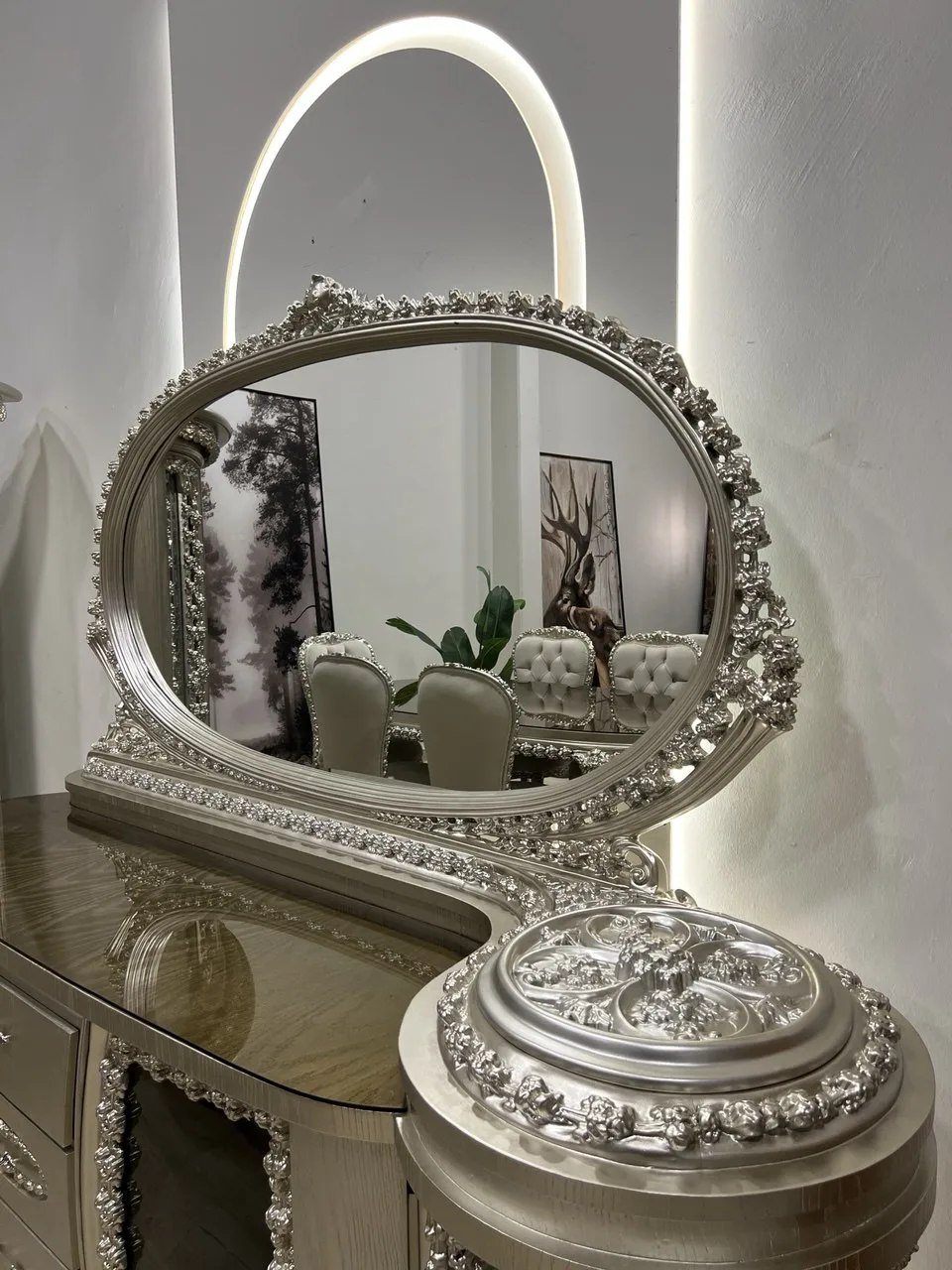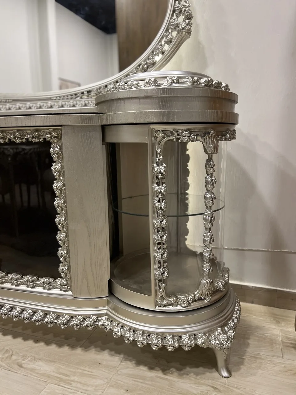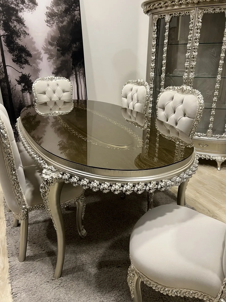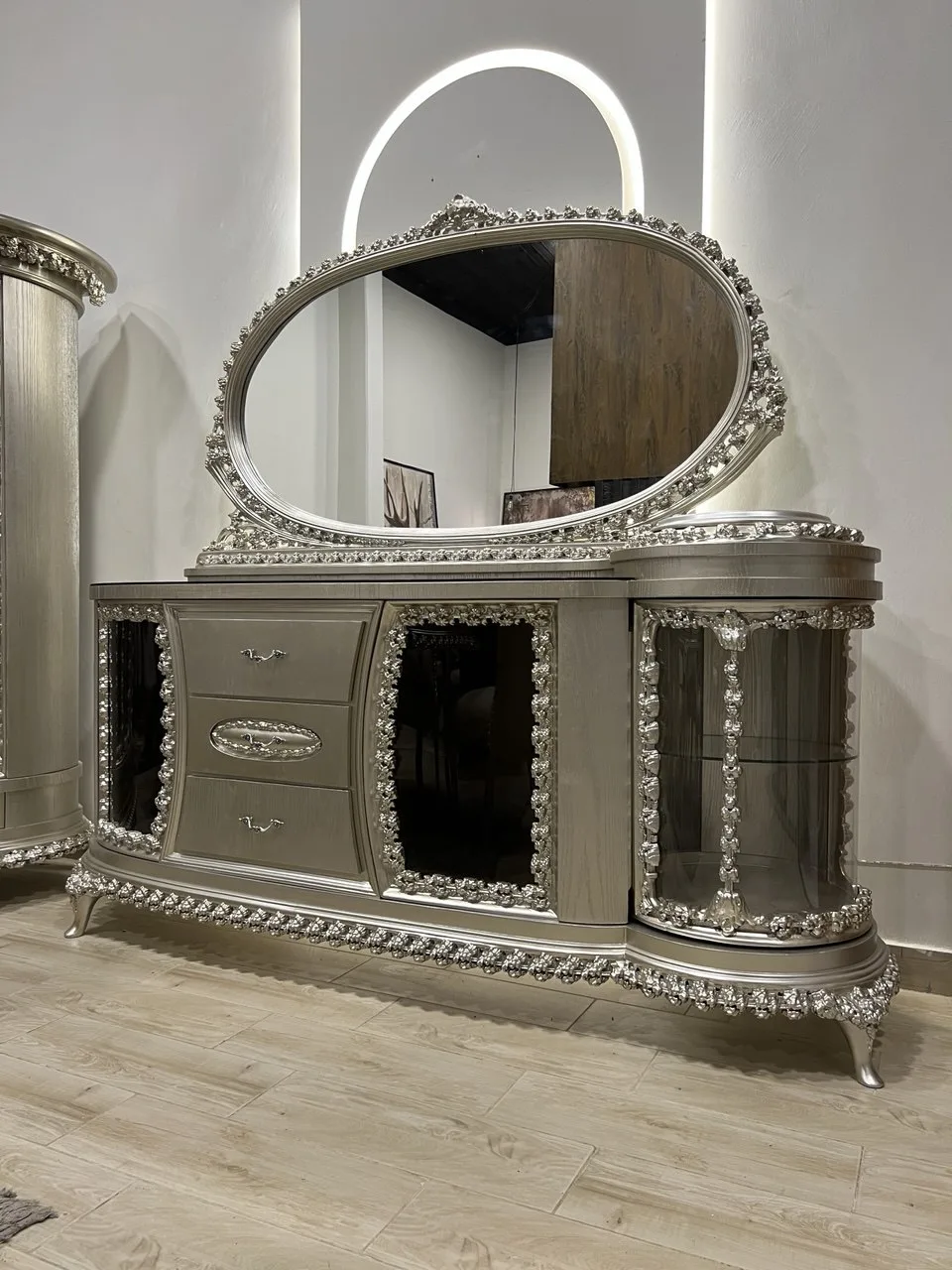 سفرة صوفيا معمولة بروح النيو كلاسيك الراقي، بخطوط ناعمة وتفاصيل منحوتة بإتقان تخلي كل قطعة فيها تحفة مستقلة. البوفيه تصميمه موزون جدًا، والأسطح متنسقة مع الخشب بشكل يبين جمال الخامة وجودة التصنيع. الكراسي مريحة، وقفتها شيك، وتفاصيل تنجيدها بتدي لمسة فنية راقية تعيش معاك سنين بنفس الأناقة.