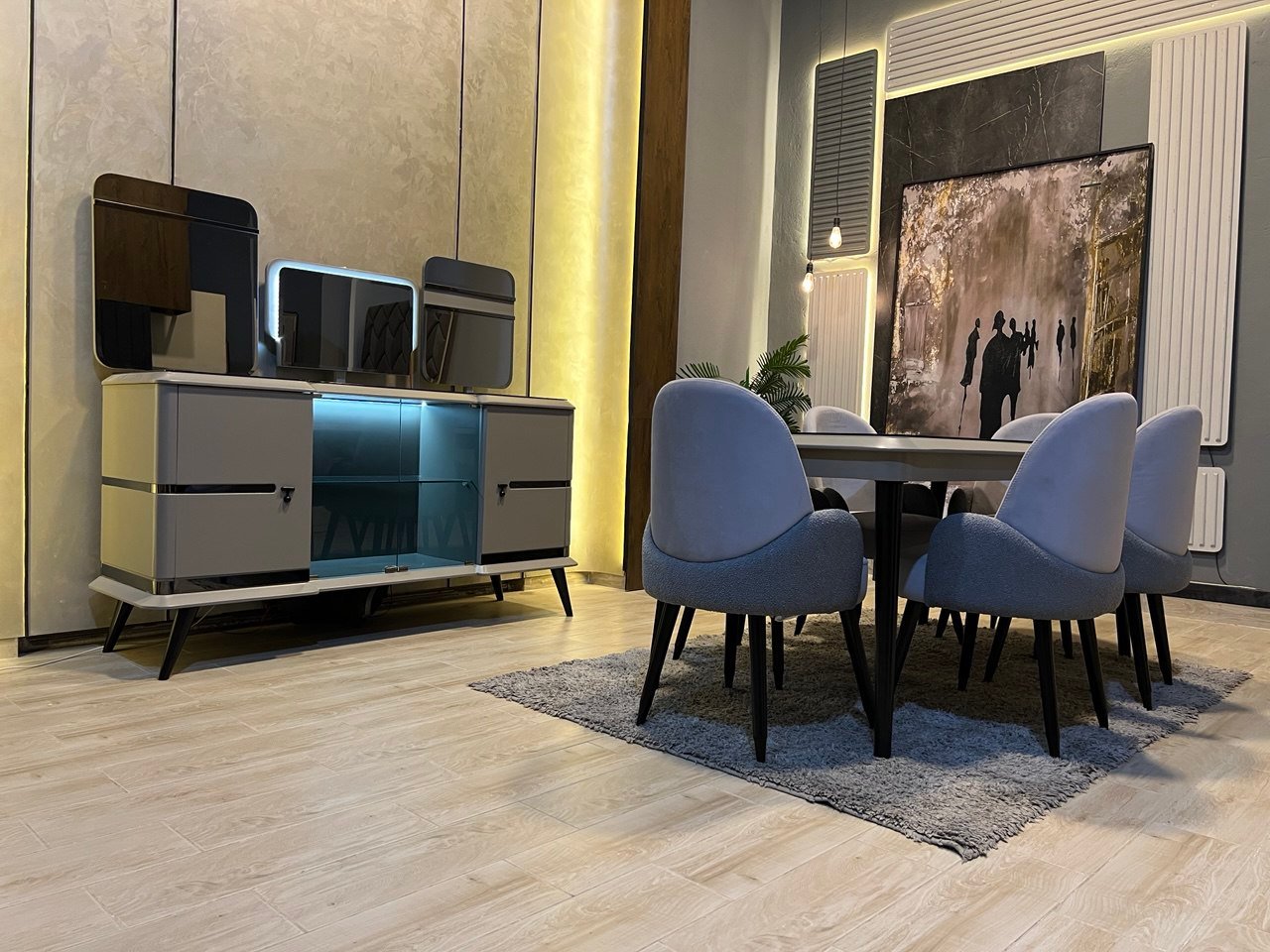 لو بتدور على غرفة سفرة مودرن بتصميم أنيق وجذاب، غرفة مونو هي الاختيار المثالي. بتجمع بين الألوان العصرية واللمسات المعدنية الراقية عشان تضيف لمسة من الفخامة والتميز على سفرتك.