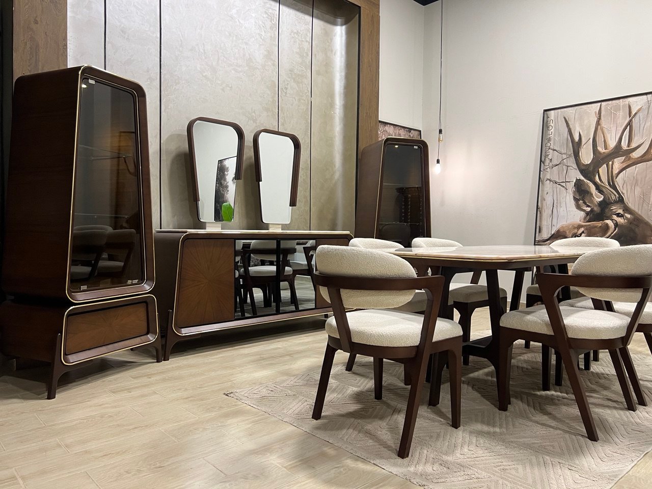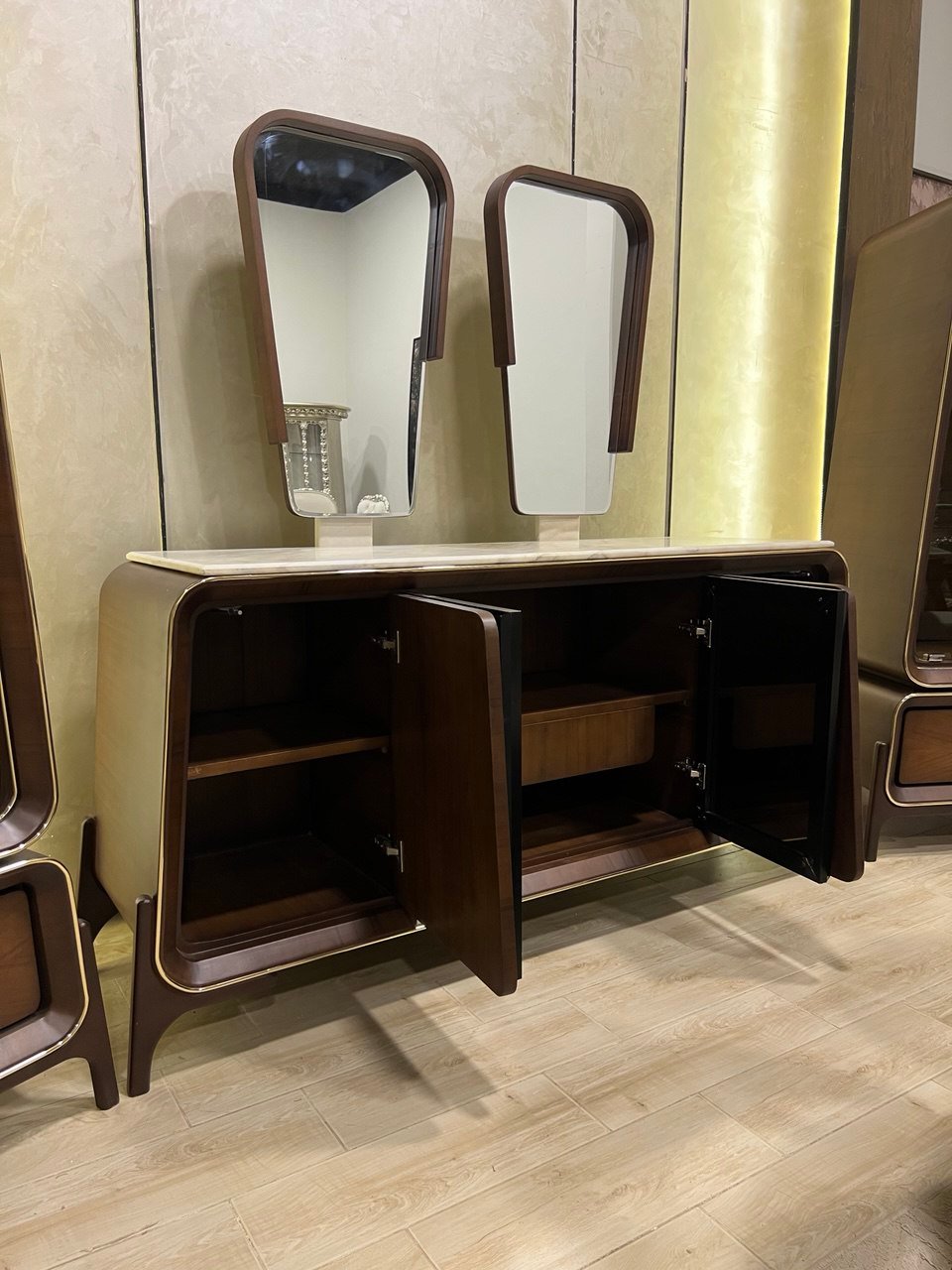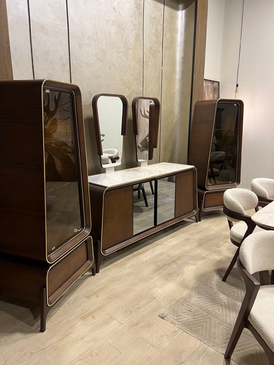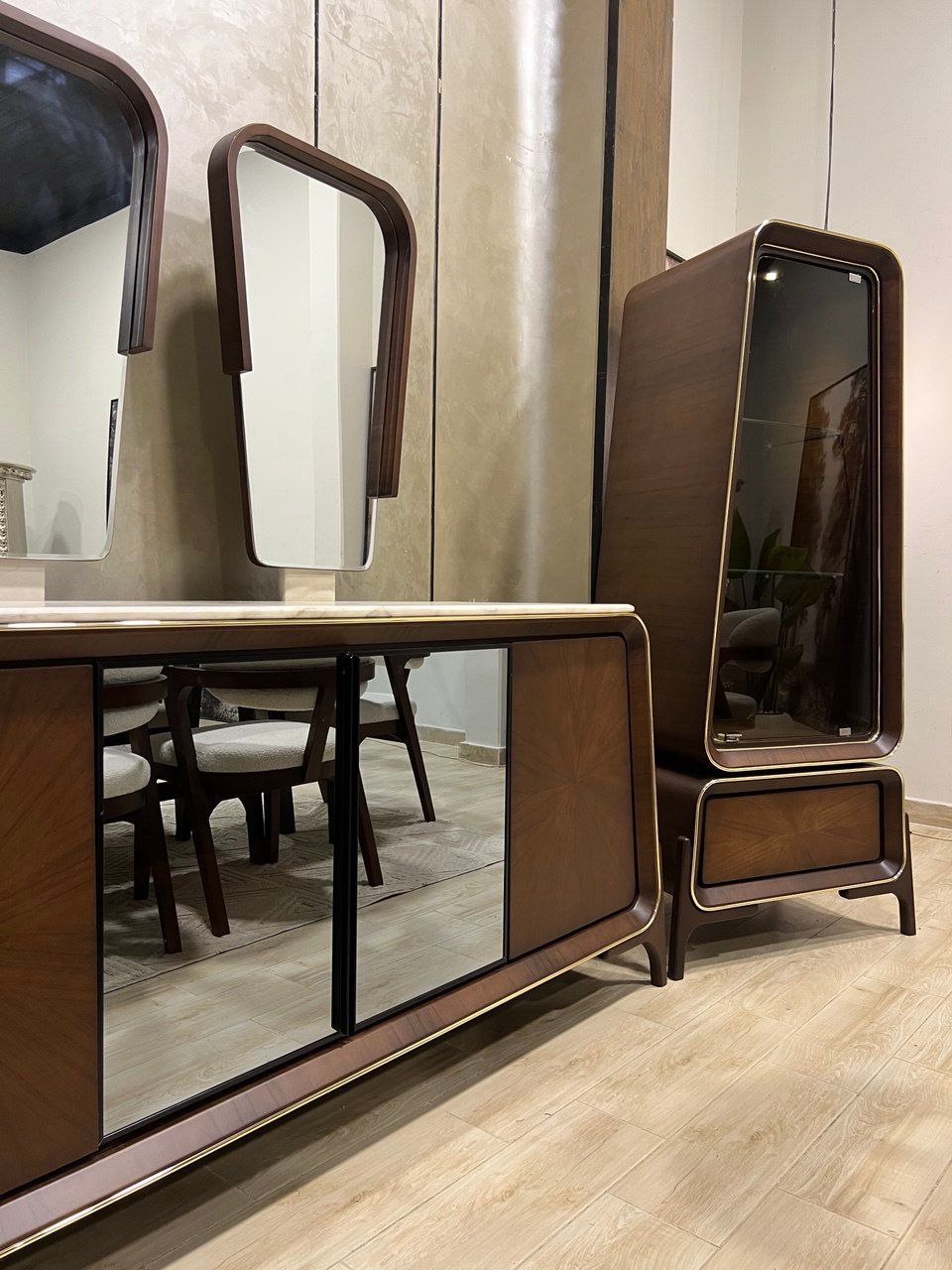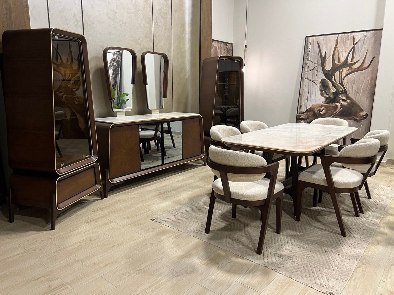 2نيش 85سم + بوفيه 200سم + 2 برواز مرايا مُعلق + تربيزة 200سم + 6 كرسي .