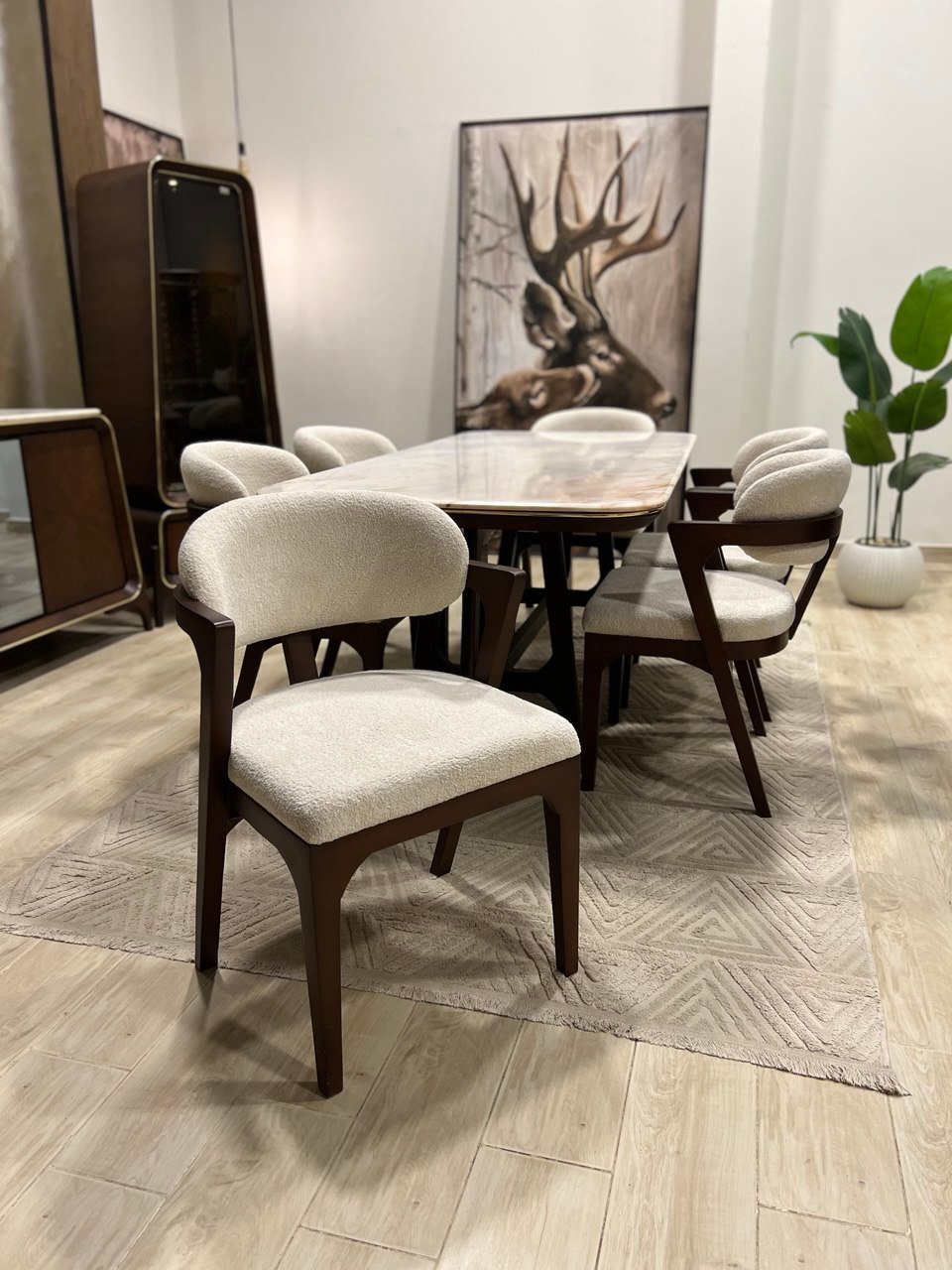 الطاولة والكراسي تصميمهم عصري ويليق بالمجالس الخليجية. الخشب ثقيل وثابت واللون أعطى لمسة دافئة للمكان.