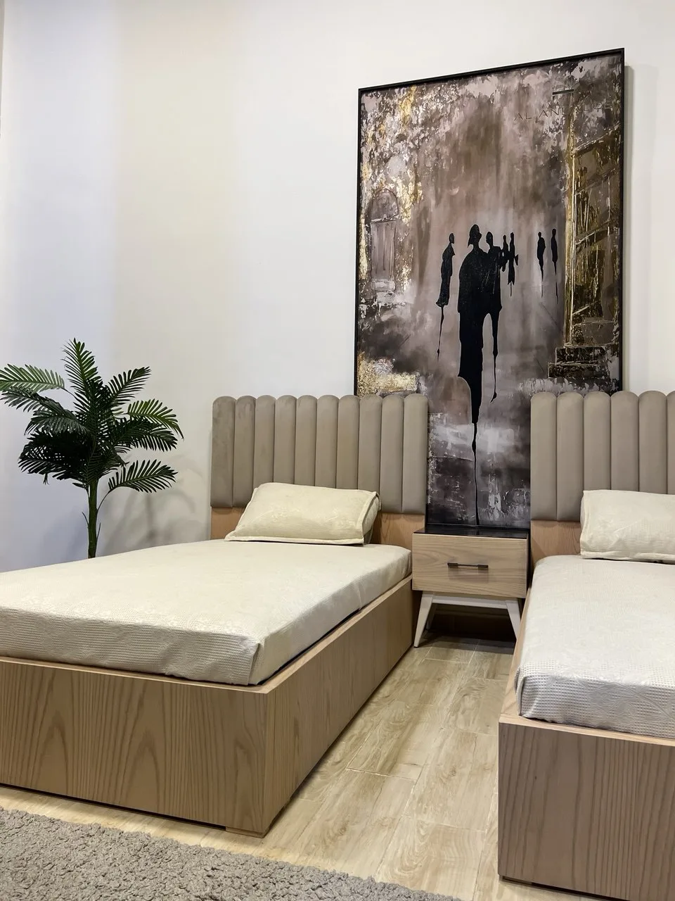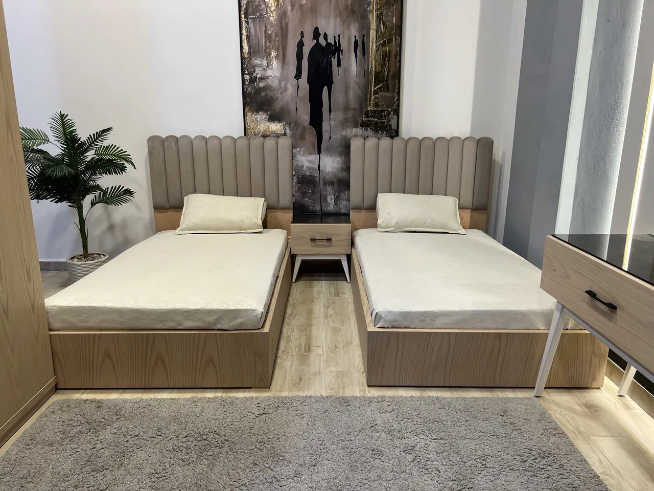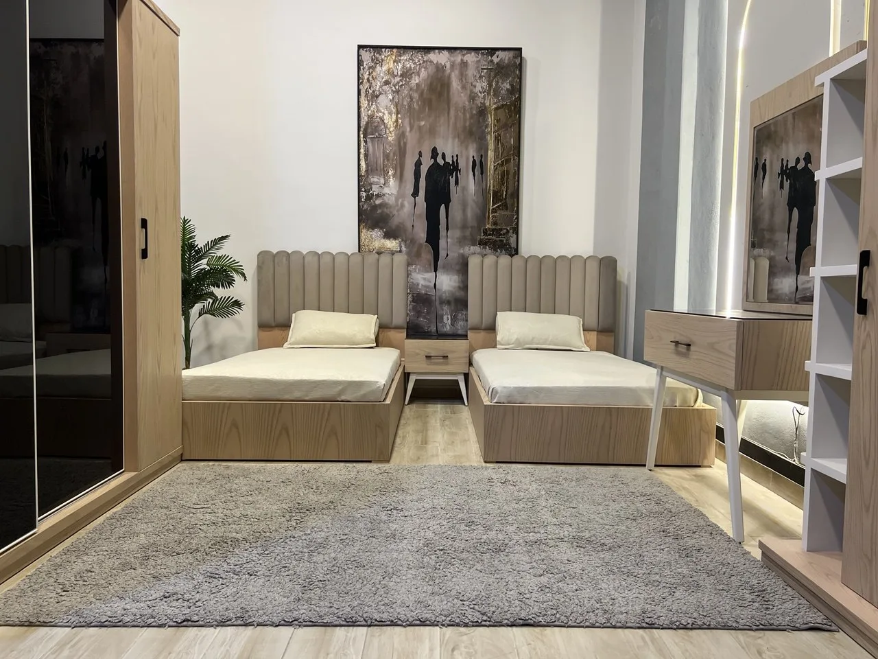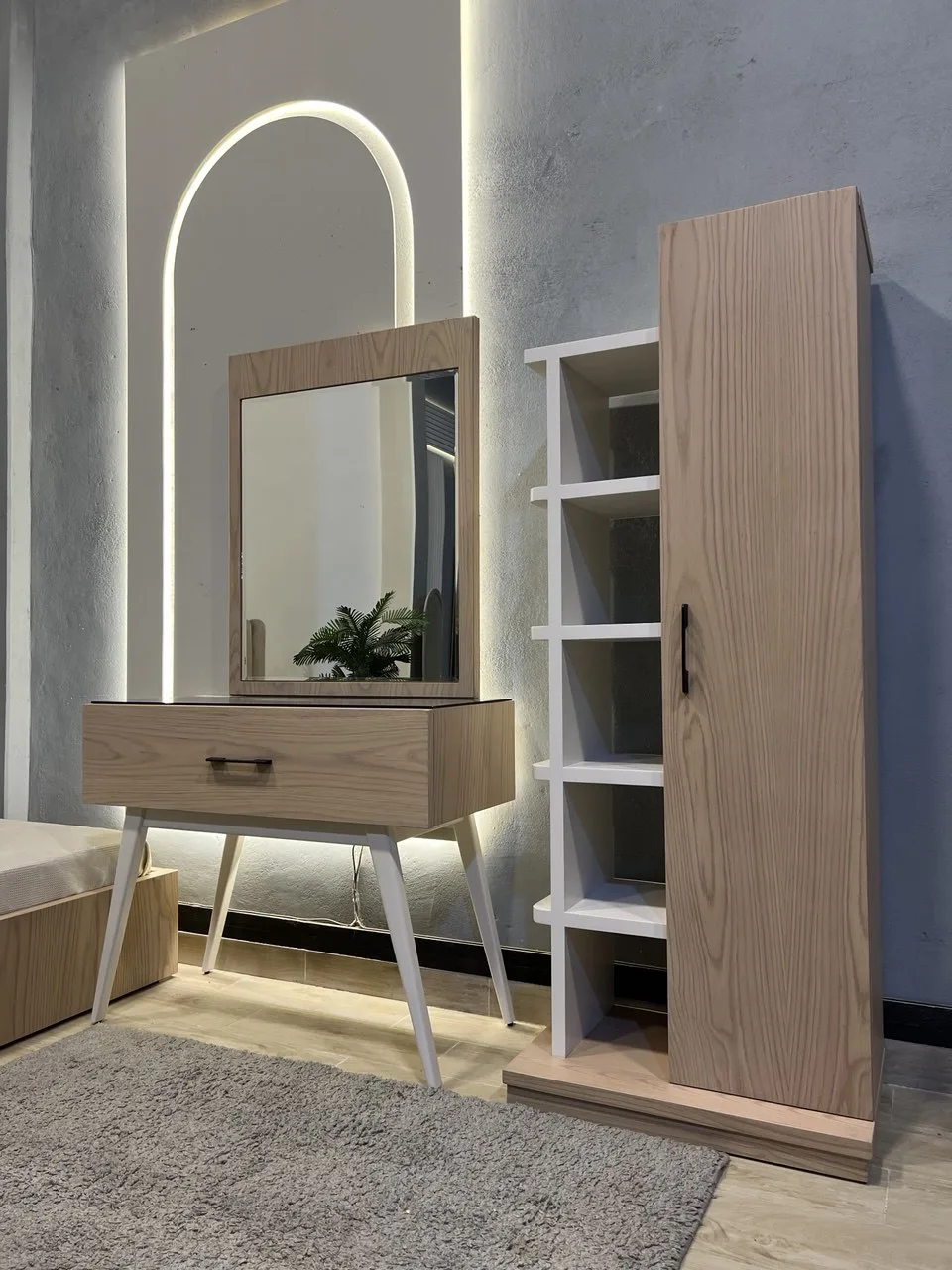 2سرير 120سم + كمود 60سم + وحدة مكتبة رأسية 50سم + دولاب جرار مع مفصلي200سم + تسريحة120سم مع برواز مرايا بإضاءة خلفية .
