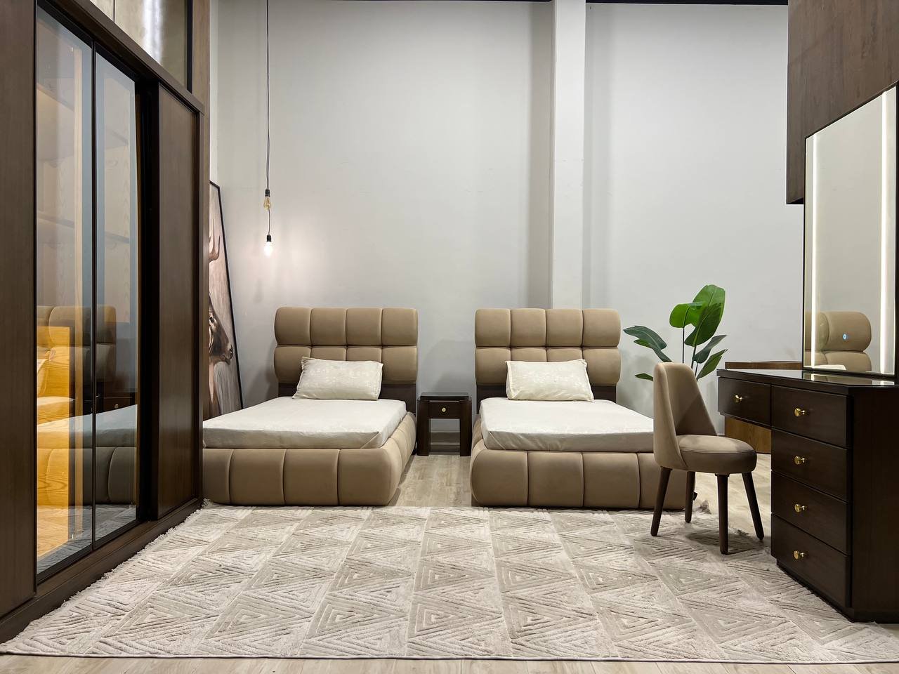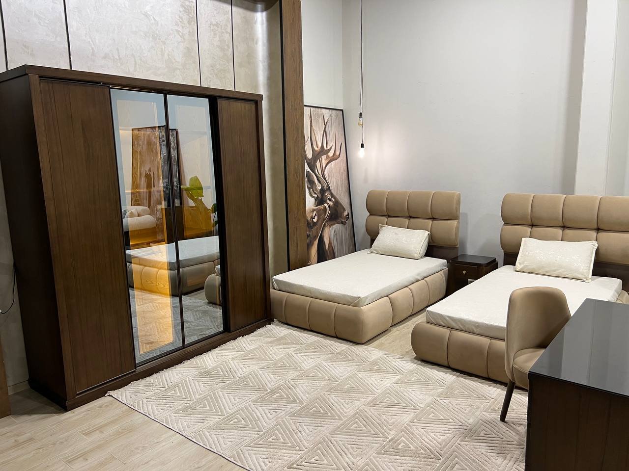 2 سرير 130سم + كمود 55سم + دولاب جرار 200سم + مكتب 90سم + كرسي مكتب .