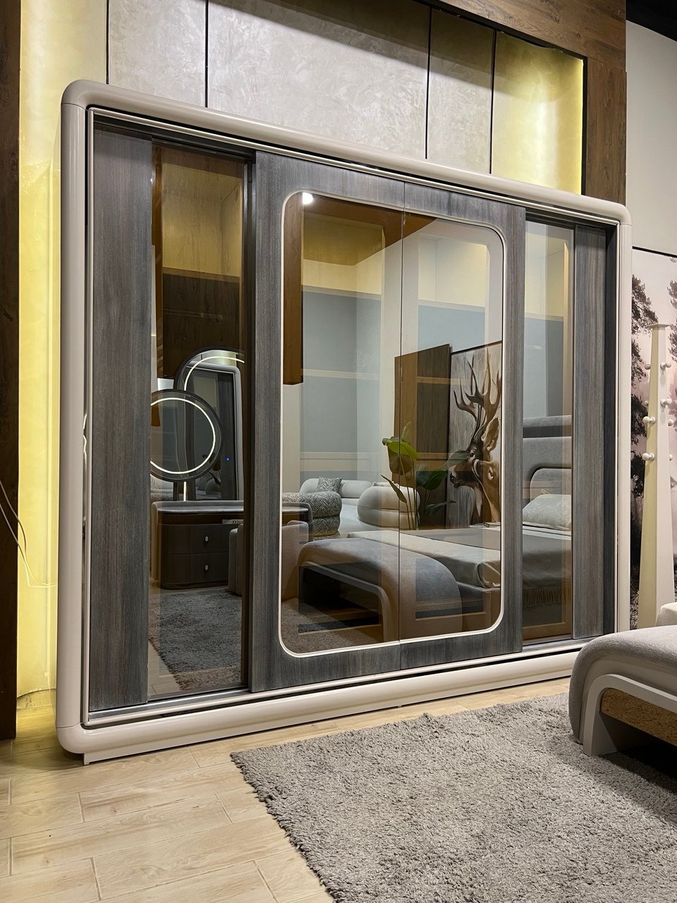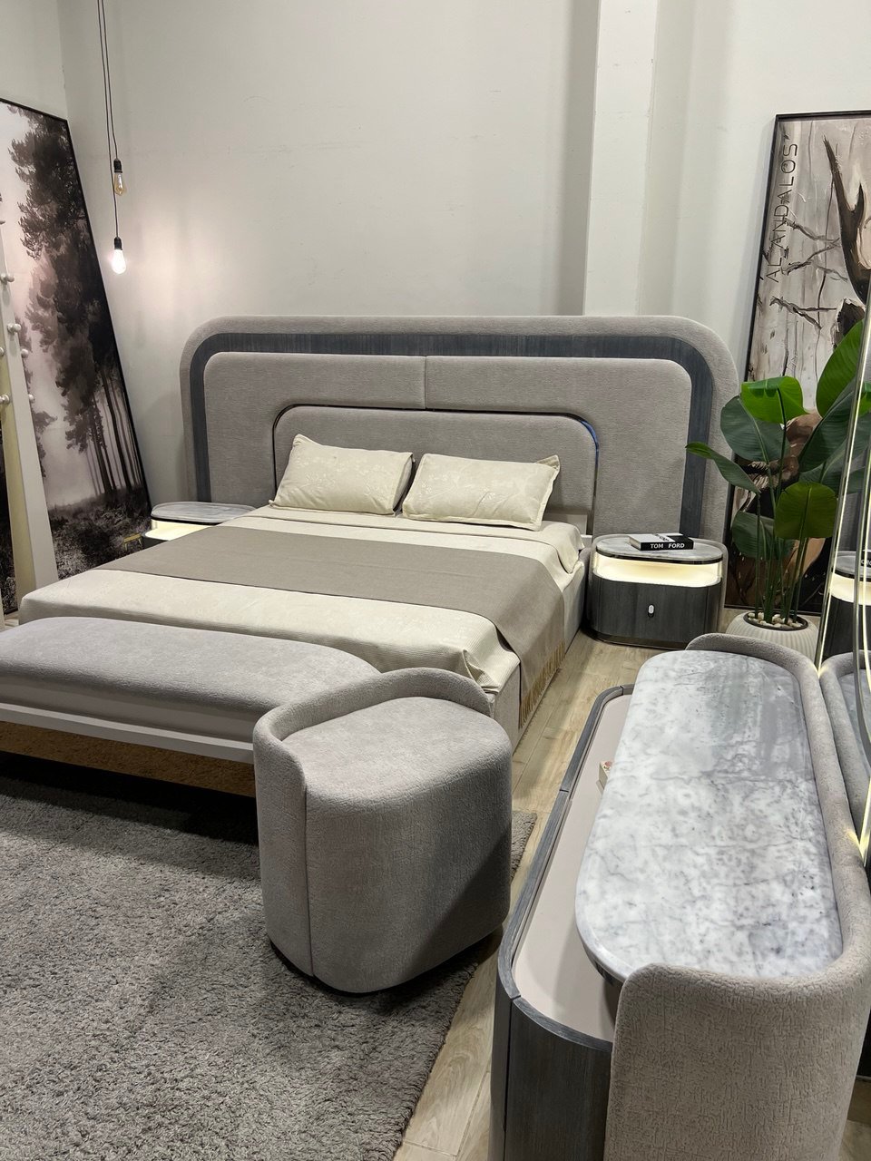 سرير 180 سم + 2 كمود 60 سم + دولاب 280 سم + تسريحة + برواز بانوراما 130سم بالمرايا + بنكت 150 سم + بف للتسريحة مميز + شماعه خلفيه .