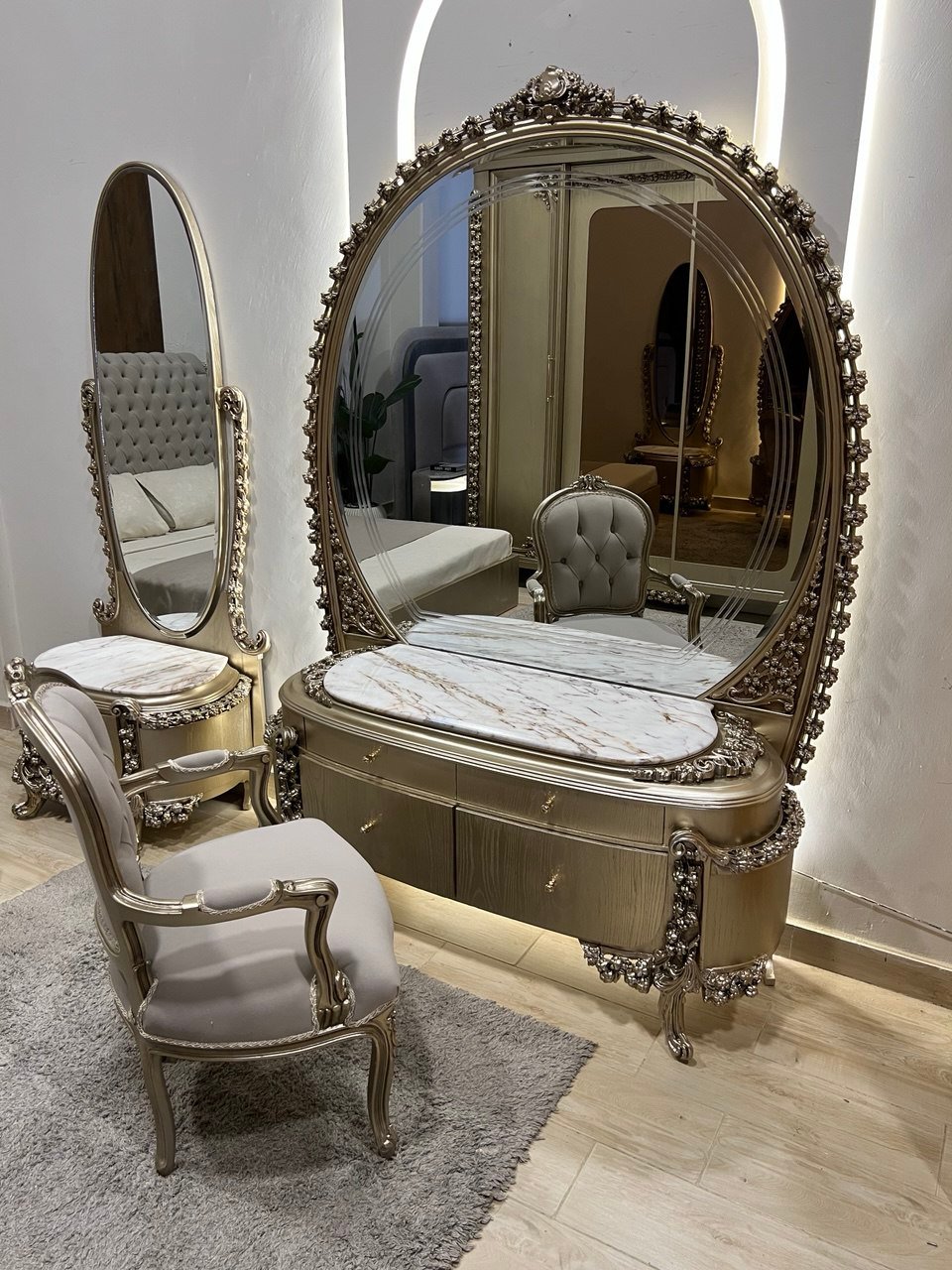 تسريحة: 160 سم مع مرآة بانوراما وحدة إضافية ببرواز مرايا دائري كرسي للتسريحة متناسق مميز شماعة رأسية