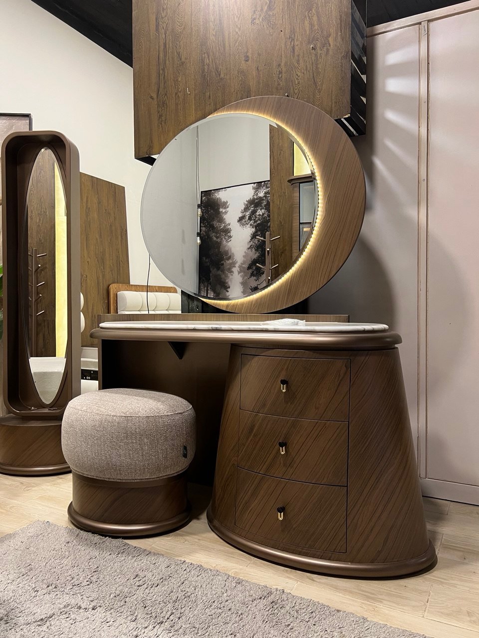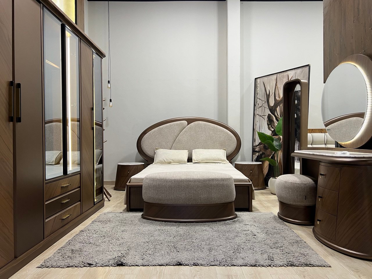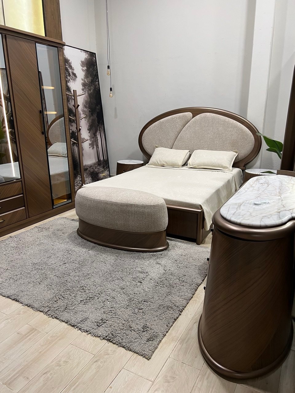 سرير 170سم من الداخل من الخارج 190سم + 2 كمود 60سم + دولاب 270سم مفصلي Soft close بوحده ادراج + تسريحة 150سم حديثة + شماعة طوليه + بف مُميز + بانكت سرير 150سم.