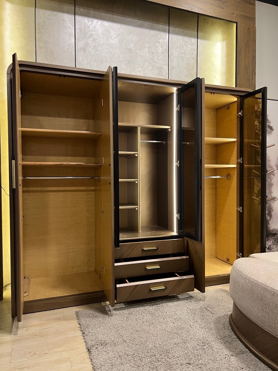 طلبت غرفة ملابس كاملة وتصميمها كان منظم ومريح جدًا. كل شيء مرتب وسهل الوصول له، وفوق هذا شكلها راقي.