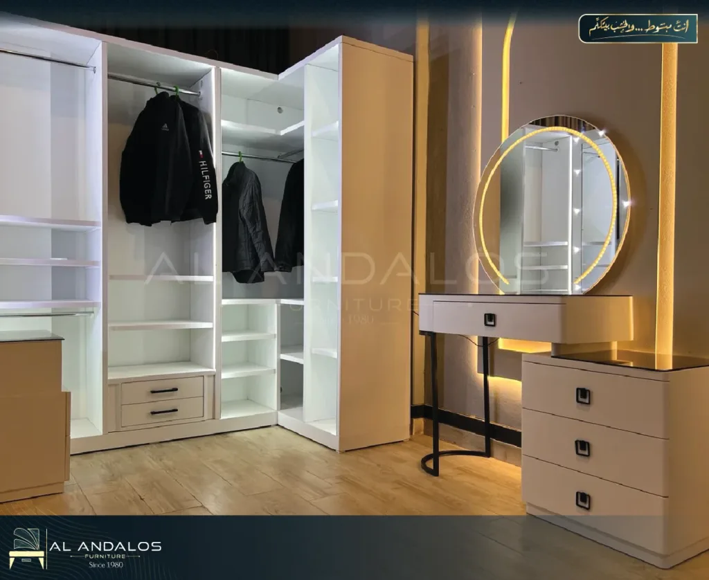طلبت غرفة ملابس كاملة وتصميمها كان منظم ومريح جدًا. كل شيء مرتب وسهل الوصول له، وفوق هذا شكلها راقي.